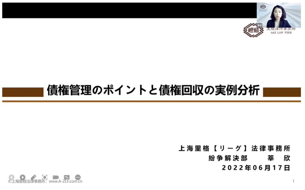 6月17日、弊所の業務提携先である華鐘コンサルタントグループは2022年度第4回月次オンライン実務セミナー(6月度)を開催しました。弊所の首席パートナーの安翊青弁護士と紛争解決部の莘欣弁護士が講師として、「コロナ禍での紛争解決」「債権管理のポイントと債権回収の実例分析」をテーマに講演させていただきました。